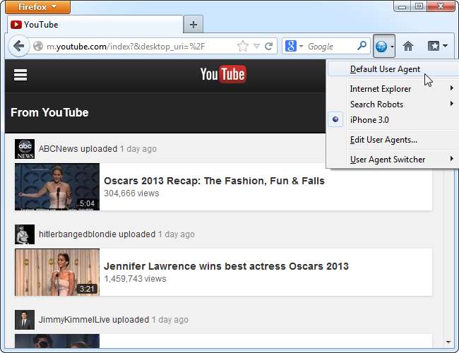 Puteți face acest lucru schimbând agentul de utilizator al browserului dvs. - am explicat anterior ce este un agent de utilizator browser . Accesarea unui site web cu un agent de utilizator iPad poate, de asemenea, să-l oblige să vă difuzeze videoclipuri HTML5, ceea ce este frumos dacă încercați să evitați Flash.