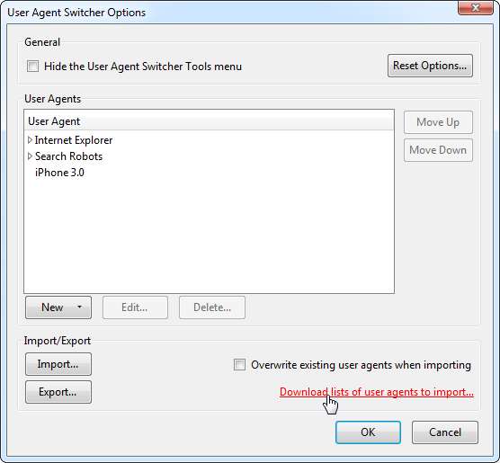 Puteți descărca agenți de utilizatori suplimentari făcând clic pe pictograma User Agent Switcher și selectând Editați agenți de utilizator. Apasă pe Descărcați listele de agenți de utilizatori de importat link și veți putea descărca și importa o listă mai cuprinzătoare de agenți de utilizatori.