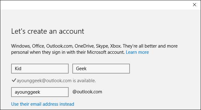 Apoi, veți completa toate informațiile pertinente necesare pentru configurarea contului copilului dvs. Dacă nu au un cont de e-mail, puteți configura un cont outlook.com pentru ei.