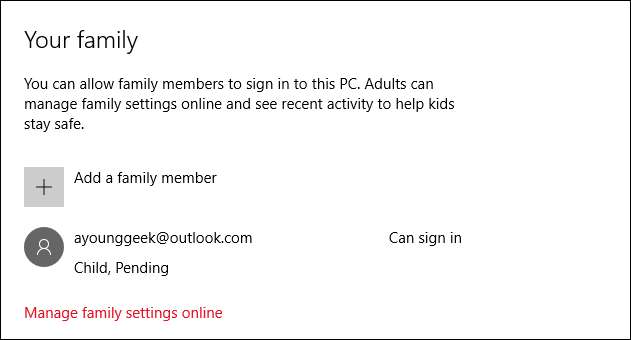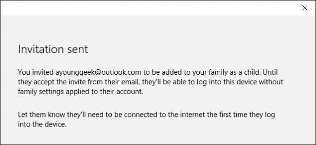 Alternativ, dacă ați stabilit deja un cont pentru copilul dvs. și îl adăugați pur și simplu la instalarea Windows 10, va trebui să vă asigurați că confirmați contul înainte ca setările familiale existente să poată fi aplicate contului său.