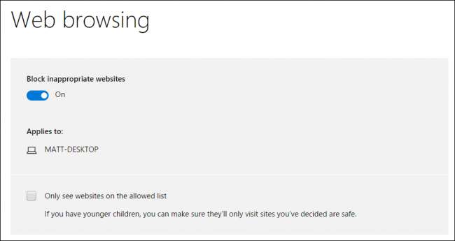 Primul element pe care veți dori să îl luați în considerare este categoria „navigare pe web”. Puteți „bloca site-uri web necorespunzătoare” și există o casetă de selectare pentru a constrânge navigarea pe web a copilului dvs. doar la site-urile web din lista permisă.