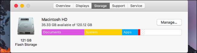 Pentru a găsi aceste caracteristici, faceți clic pe meniul Apple din colțul din stânga sus al ecranului și selectați „Despre acest Mac”. Faceți clic pe fila „Stocare” din fereastra care apare și faceți clic pe butonul „Gestionați”.