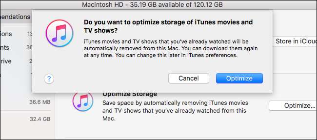 Faceți clic aici pe butonul „Optimizați” și acceptați ca iTunes să elimine automat copiile locale ale filmelor și emisiunilor TV pe care le-ați vizionat.