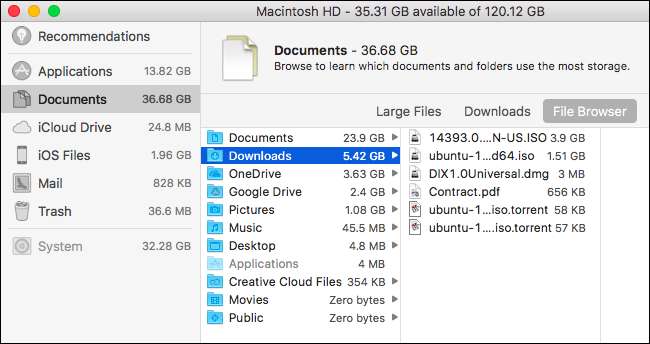 Butonul „Reduceți dezordinea” de aici vă invită să căutați fișierele pentru a le șterge pe cele pe care nu le mai folosiți. Faceți clic pe categoria „Documente” din bara laterală - făcând clic pe butonul „Reduceți dezordinea” vă duce și aici - și veți vedea categorii pentru „Fișiere mari”, „Descărcări” și „Browser de fișiere”.