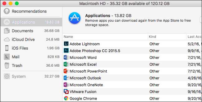 Alte opțiuni din bara laterală vă arată ce folosește spațiul. De exemplu, categoria „Aplicații” vă arată aplicațiile de pe Mac și le sortează în funcție de dimensiunea dvs. Eliberați spațiu eliminând aplicațiile pe care nu le mai folosiți. Aplicațiile pe care le-ați descărcat din Mac App Store pot fi re-descărcate de acolo în viitor, iar aplicațiile pe care le-ați descărcat din alte părți pot fi descărcate din nou și ulterior.
