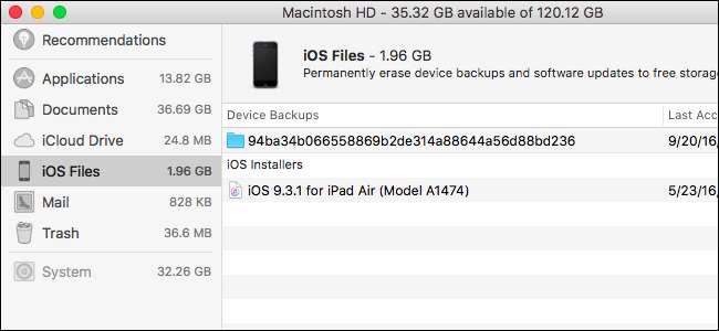 Categoria Fișiere iOS arată cât spațiu utilizează fișierele legate de iPhone și iPad pe computer. De exemplu, copiile de siguranță ale dispozitivelor create cu iTunes și instalatorii iOS sunt afișați aici, astfel încât să le puteți găsi și șterge cu ușurință dacă nu mai aveți nevoie de ele.
