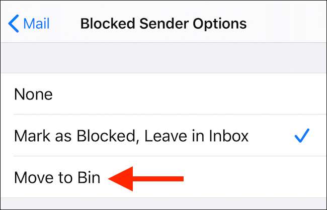 Ce se întâmplă dacă nu doriți să apară deloc un e-mail de la un expeditor blocat în Mesaje primite? O opțiune din aplicația „Setări” trimite direct orice e-mail nou de la un contact blocat în „Bin”.