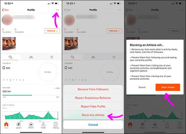 Accesați persoana pe care doriți să o blocați pe pagina de profil de pe Strava și atingeți cele trei puncte mici din colțul din dreapta sus.