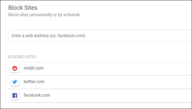 Iti recomandam Block Site pentru Chrome pentru blocarea rapidă a site-urilor web. Instalați-l și puteți utiliza opțiunile simple ale extensiei pentru a defini o listă de site-uri blocate. Puteți chiar să configurați o redirecționare, astfel încât să fiți îndreptat automat către un site web pe care ar trebui să îl utilizați (poate site-ul web al locului dvs. de muncă) atunci când vizitați un site blocat. Sau activați-l într-un program, astfel încât să puteți privi Facebook tot ce doriți - atâta timp cât este în afara orelor pe care ar trebui să le definiți.