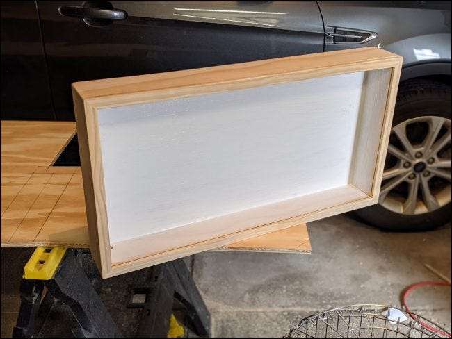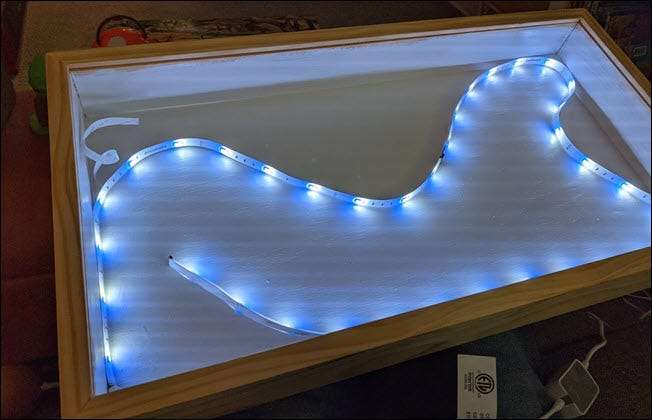 Alternativ, puteți cumpăra a cutia umbrei care se potrivește cu lungimea benzii de lumină. Luminile noastre sunt lungi de 72 de centimetri, astfel încât caseta de umbră de 18- x 18 inch sau 12- x 24 inch ar fi perfectă. Puteți banda o hârtie de imprimantă sau pergament la geam sau acrilic pentru a crea un difuzor de lumină.