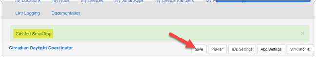 Faceți clic pe "Salvați" după crearea SmartApp, dar aceasta nu trebuie publicată.