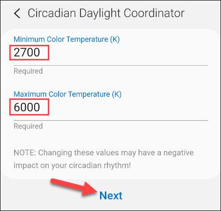 Primul lucru pe care trebuie să-l faceți este să alegeți temperaturile minime și maxime ale culorii. Pentru referință, răsăritul soarelui și apusul de soare sunt în jur de 2.700k, în timp ce la prânz, este de aproximativ 6000k. Verificați specificațiile benzii de lumină pentru a vedea cât de aproape puteți ajunge la aceste numere. Când ați terminat, atingeți "Următorul".