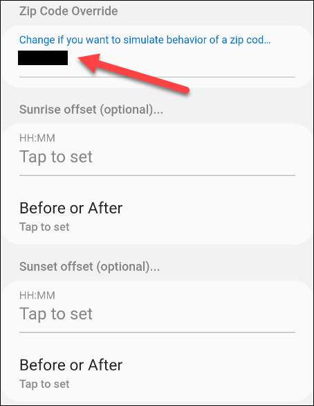 Pentru prima, introduceți codul dvs. poștal, apoi alegeți o compensare pentru răsăritul soarelui și apusul soarelui.