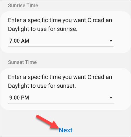 Pentru a seta manual răsăritul soarelui și apusul soarelui, derulați în jos și selectați un timp pentru fiecare. Acest lucru este deosebit de frumos pentru acele vremuri ale anului când soarele se fixează mai devreme. Când ați terminat, atingeți "Următorul".