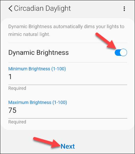 Puteți comuta - pe opțiunea "luminozitate dinamică" dacă doriți ca lumina să se diminueze pentru a se potrivi cu lumina naturală. Tipul de valori pentru luminozitatea minimă și maximă, apoi apăsați pe "Următorul".