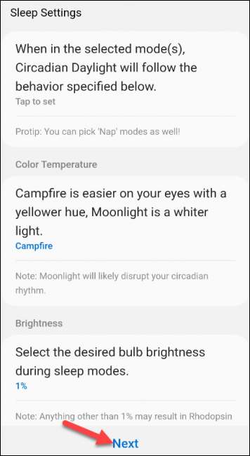 Acum puteți decide dacă doriți să setați orice "setări de somn". Dacă faceți, selectați doar modul (modurile) pentru care ar trebui să funcționeze, cât de cald sau răcește temperatura de culoare trebuie să fie, apoi selectați un nivel de luminozitate. Atingeți "Următorul" când ați terminat.