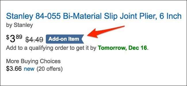 Dacă nu știți despre ce vorbim, aruncați o privire la aproape orice articol la prețuri sub 5 USD pe site-ul Amazon. Probabil va purta o insignă albastră lângă prețul său, pe care scrie „Articol suplimentar”. La început, este destul de confuz în ceea ce privește modul în care acest tip de articol diferă de altele, dar înseamnă că, pentru a cumpăra acel articol, costul comenzii dvs. trebuie să însumeze cel puțin 25 USD în valoare de articole expediate de Amazon.