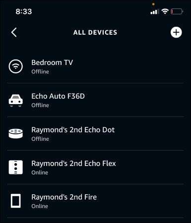 Pe ecranul "Toate dispozitivele", veți vedea o listă a tuturor dispozitivelor disponibile cu Alexa disponibile, fiecare afișând icoanele lor respective și starea online / offline. Atingeți dispozitivul de la alexa pe care doriți să-l schimbați accentul.