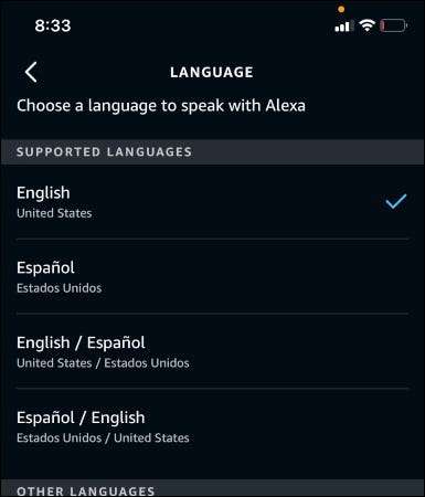 Odată ce se încarcă pagina dispozitivului de la alexa, apăsați pe "Limbi" și alegeți limba sau accentul dorit. Unele dintre cele disponibile includ english american, canadian, Marea Britanie și accente australiene.