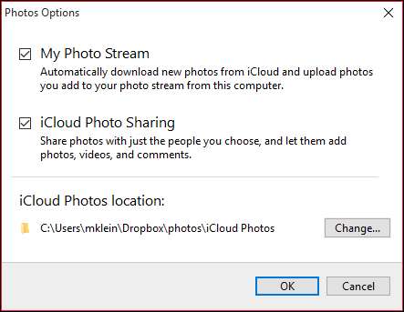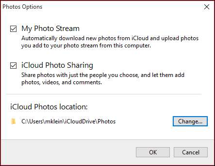 Aici puteți dezactiva „Fluxul meu de fotografii” și „Partajarea fotografiilor iCloud”, dar pe ce dorim să ne concentrăm este „Locația fotografiilor iCloud:” din partea de jos a casetei de dialog. Faceți clic pe „Modificare ...” pentru a muta folderul iCloud Photos într-o locație nouă.