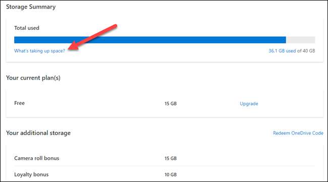 Cea mai ușoară modalitate de a vă verifica spațiul de stocare onedrime este de a merge la onedrive.live.com/managestorage într-un browser web. Acolo, veți vedea o defalcare a numărului de stocare pe care îl utilizați. Selectați "Ce se ocupă de spațiu" pentru a vedea cele mai mari fișiere pe care le-ați stocat.