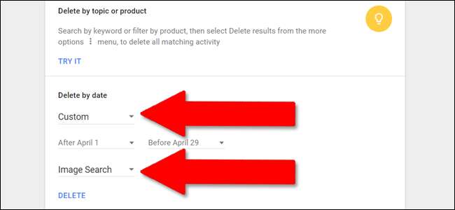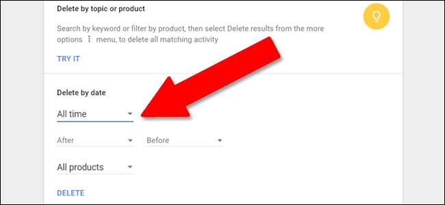 Din această pagină, puteți șterge toată activitatea dvs. pentru toate căutările monitorizate, site-urile web și aplicațiile Android. Sub „Ștergeți după dată”, selectați „Tot timpul”. Puteți lăsa selectat „Toate produsele” implicit sau puteți alege doar „Căutare” pentru a șterge doar istoricul căutărilor Google.