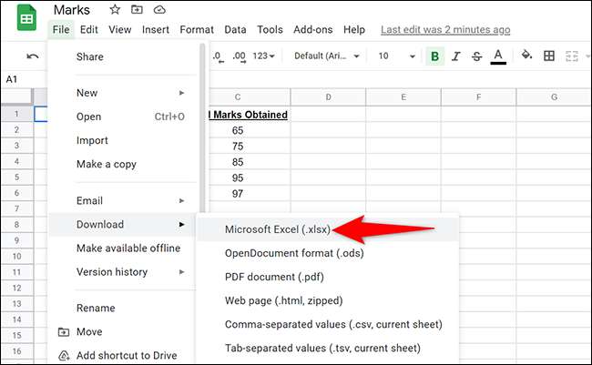 Din bara de meniu din ecranul de editare a foilor, selectați File & GT; Descărcați & GT; Microsoft Excel.