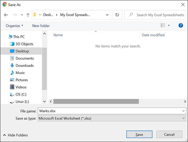 Veți vedea fereastra standard "Save" a computerului pentru a salva fișierul Excel. Aici, selectați un dosar pentru a salva fișierul, introduceți un nume pentru fișierul dvs. și faceți clic pe "Salvați".