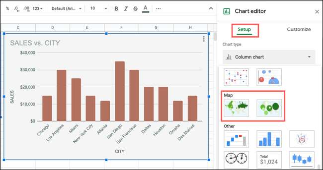 Puteți edita oricare dintre personalizările pe care le faceți mai sus în orice moment. Dar dacă doriți să modificați tipul de diagramă sau gama de date sau lucrați cu longitudine și latitudine, utilizați fila Setup din bara laterală a editorului de diagramă.
