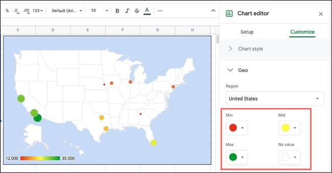 Apoi, puteți ajusta culorile pentru elementele minime, mijlocul, max și fără valoare de pe hartă. Doar asigurați-vă că utilizați culori ușor pentru publicul dvs. pentru a vedea.