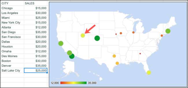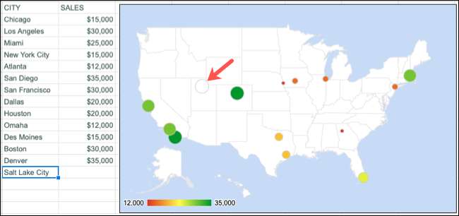 Lucru frumos despre diagrama hărții din Google Foile este că puteți adăuga sau elimina automat datele din foaie și actualizările diagramei.