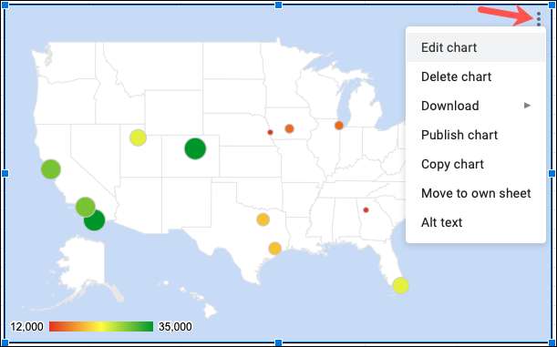Aveți câteva opțiuni suplimentare pentru diagrama hartă creați în Google Foi de calcul. Faceți clic pe cele trei puncte de pe partea din dreapta sus a graficului și veți vedea aceste acțiuni.