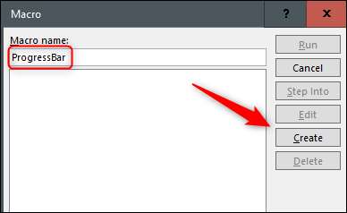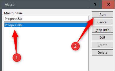 Apoi, alegeți numele macro ("Progressbar" în exemplul nostru) pentru ao selecta, apoi faceți clic pe "Rulați".