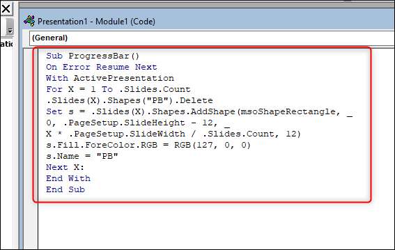 Pentru a păstra totul consecvent și pentru a vă salva o durere de cap gravă, puteți Utilizați un macro. pentru a crea o bară de progres. Cu această macro, bara de progres se va ajusta automat pe baza numărului de diapozitive din prezentare.