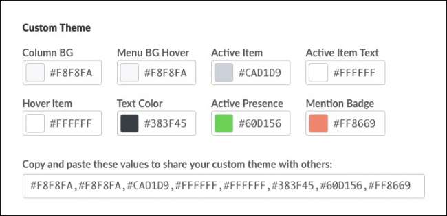 Nu vă limitați la cele opt teme incluse. Puteți personaliza aspectul lui Slack pentru practic orice stil doriți. Introduceți doar valoarea hexazecimală pentru fiecare componentă pe care doriți să o modificați.