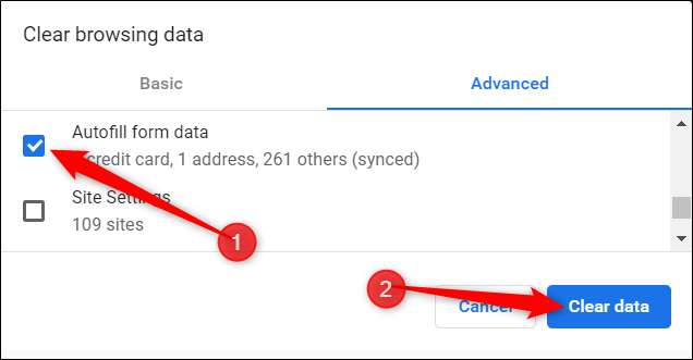 Derulați până vedeți „Completarea automată a datelor din formular” și asigurați-vă că este bifat pentru ștergere. Dacă doriți să păstrați toate celelalte așa cum sunt - parole, istoric de navigare, cookie-uri etc. - asigurați-vă că debifați acele casete; în caz contrar, datele vor fi eliminate și ele. Când ați terminat bifarea și debifarea casetelor, dați clic pe „Ștergeți datele”.