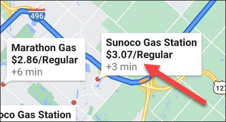 Stațiile de benzină vor fi afișate pe partea de sus a traseului dvs. Ele afișează, de asemenea, prețul curent al gazului și cât timp va fi adăugat în călătoria dvs. dacă vă opriți. Derulați în jurul rutei și selectați una din locații.