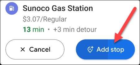 Acesta este un mare truc de știut pentru că nu trebuie să ieșiți de navigație pentru ao face. Puteți adăuga pur și simplu o oprire pe traseul existent, umpleți vehiculul la benzinărie și apoi continuați în călătorie. Nu trebuie să opriți niciodată Google Maps.