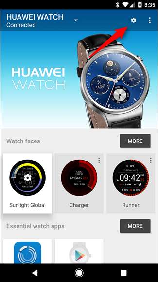Primele lucruri mai întâi: continuați și treceți în aplicația Android Wear de pe telefon. După ce sunteți acolo, atingeți pictograma mică dințată din colțul din dreapta sus.