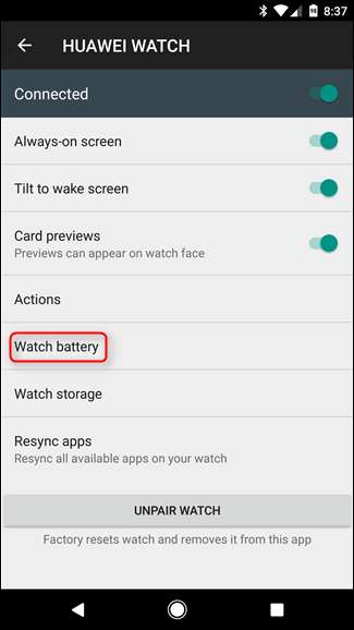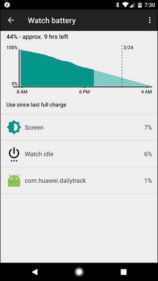 Încărcarea va dura câteva secunde (poate ceva mai mult), deoarece telefonul trebuie să scoată datele de pe ceas. Cu toate acestea, odată ce totul a funcționat, ar trebui să pară destul de familiar, deoarece folosește aceeași interfață ca și setările bateriei Android.