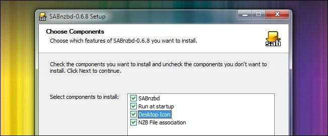 Luați o copie a SABnzbd pentru sistemul dvs. de operare aici , apoi executați programul de instalare (este în mare parte un tip de instalare care face clic pe următor). Singurul lucru pe care vrei să-l faci este să verifici toate opțiunile de pe ecranul Alege componente. Doriți ca SABnzbd să ruleze la pornire, astfel încât să funcționeze întotdeauna și doriți să asociați fișierele NZB cu aplicația.