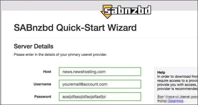 După finalizarea instalării, browserul dvs. web implicit va deschide o conexiune la gazda locală de pe portul 8080, unde veți fi întâmpinat de Expertul de pornire rapidă SABnzbd. Selectați limba dvs., apoi faceți clic pe butonul „Start Wizard”. Adăugați detaliile dvs., care pentru Newshosting vor fi: