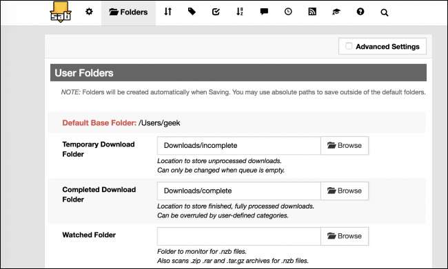 Dacă rulați SABnzbd pe computerul dvs. desktop, cea mai mare modificare pe care doriți să o faceți imediat este să setați folderul urmărit astfel încât atunci când descărcați un fișier NZB, acesta să fie preluat automat de SABnzbd și începe descărcarea dvs. imediat. Accesați Config și apoi faceți clic pe opțiunea „Foldere” din partea de sus. De acolo, schimbați folderul urmărit în același loc în care ați setat browserul să descarce - de obicei doar folderul Descărcări din directorul dvs. de acasă.