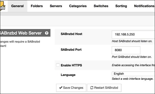 Dacă doriți să accesați SABnzbd de pe alt computer - poate îl instalați pe serverul de acasă - va trebui să accesați Setări și apoi să faceți clic pe fila „General” din partea de sus. În mod implicit, serverul ascultă pe adresa loopback 127.0.0.1, mai degrabă decât adresa IP reală, deci veți dori să o schimbați aici. Pentru trimitere, Iată cum să vă găsiți adresa IP , Si deasemenea cum se setează o adresă IP statică .