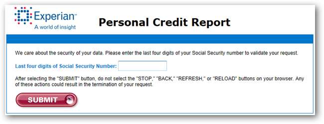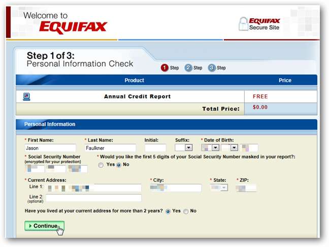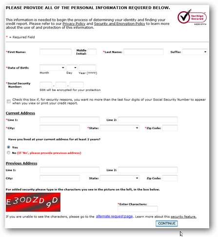 Va trebui să furnizați câteva informații personale, așa că completați formularul și faceți clic pe Continuare. Pentru confortul dvs., aceste informații vor fi trimise automat fiecărei agenții de credit de la care solicitați un raport, astfel încât să nu mai trebuie să le retipați.
