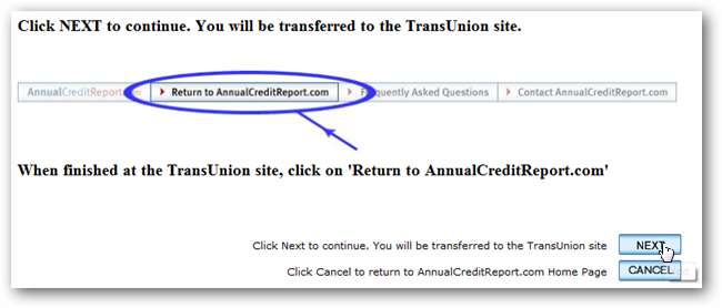 Înainte de a vizita prima selecție, vi se va solicita o notificare cu privire la modul de navigare înapoi la AnnualCreditReport.com de pe site-ul agenției de credit. Faceți clic pe Înainte pentru a obține primul raport de credit.