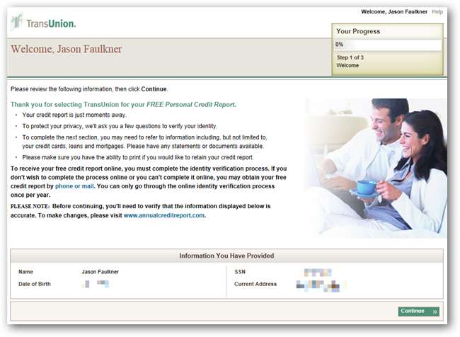 Când vizitați TransUnion, informațiile pe care le vedeți în partea de jos a secțiunii „Informații pe care le-ați furnizat” ar trebui să imite ceea ce ați introdus prima dată în AnnualCreditReport.com. Verificați dacă acest lucru este corect și faceți clic pe Continuare.