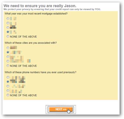 Apoi vi se vor prezenta câteva întrebări de securitate cu privire la istoricul dvs. de credit. Acestea sunt pentru a vă verifica identitatea, așa că răspundeți-le corespunzător și faceți clic pe Următorul.