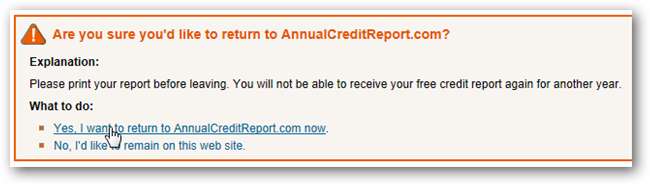 După ce ați salvat raportul dvs. de credit, faceți clic pe linkul Reveniți la AnnualCreditReport.com din partea de sus. Nu veți primi o notificare de avertizare după ce faceți clic pe acest link, deci asigurați-vă că ați tipărit sau ați salvat raportul.