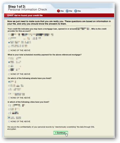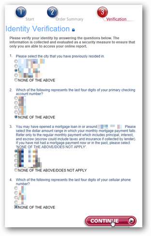 Ca ultim pas, Experian vă va pune o serie de întrebări de verificare cu privire la istoricul dvs. Răspundeți la acestea în mod corespunzător și faceți clic pe Continuare.